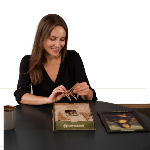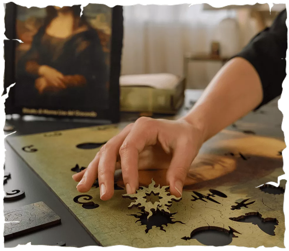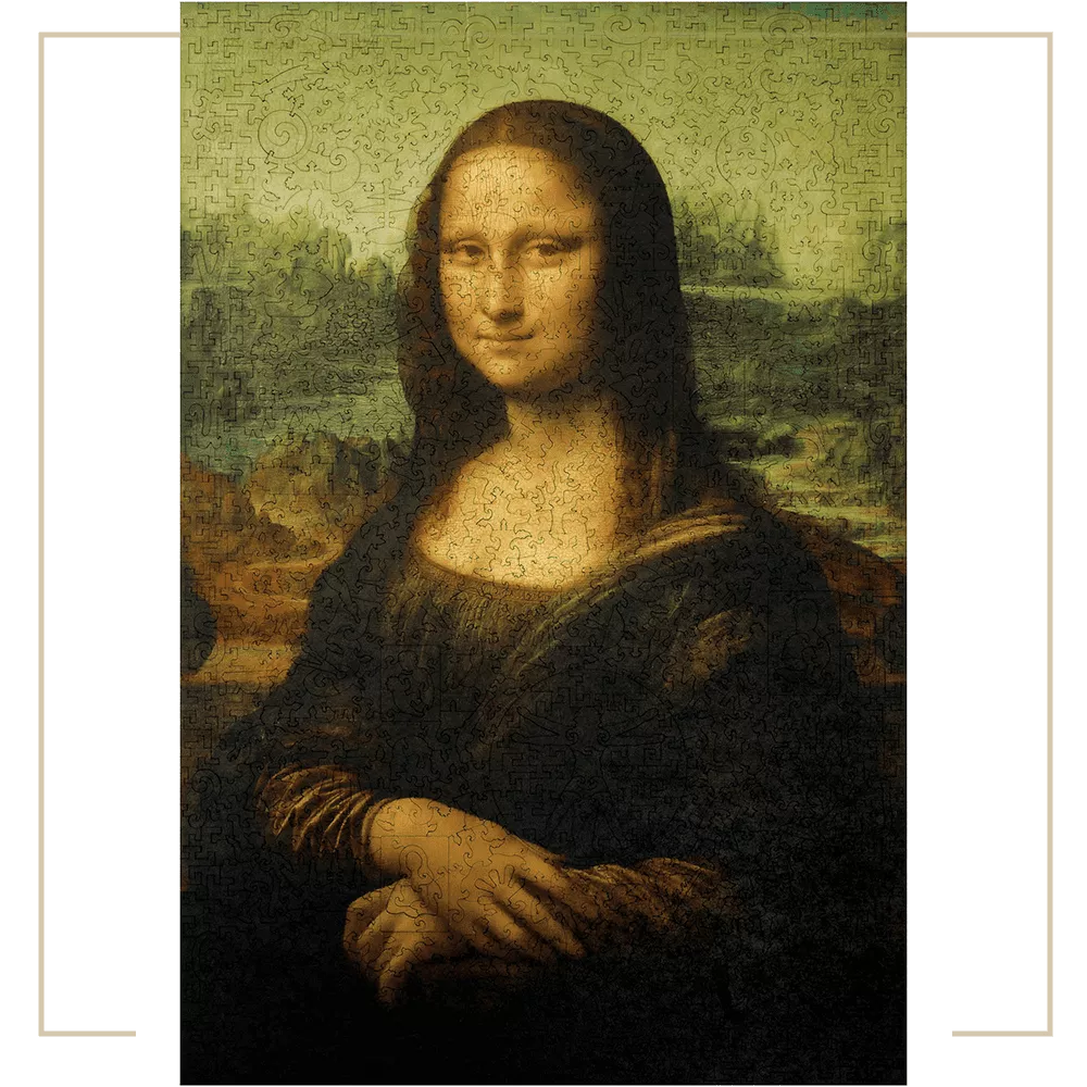 The main masterpiece of the Italian Renaissance, the most mysterious and famous painting in the world. They say Da Vinci fumed his workshop with smoke to achieve a slight blur of lines and colors. We carefully preserved the unique tone of the painting, the slightest cracks in the coating and the style of painting of the artist. Whimsy pieces of the puzzle will show you the artist's hobbies, and the history of his formation. You can even collect the name of the picture using lettered pieces! Premium lacquer gift packaging, and craft paper with drafts and sketches by Da Vinci inside. Each box contains a mini easel with a copy of the picture, which will serve you as a hint when assembling the puzzle.