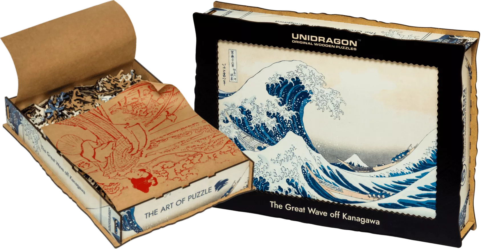 Experience the revered masterpiece from the Land of the Rising Sun that stirred the hearts of impressionists and artists of many genres. The modern Unitouch printing technology faithfully captures the style, finesse, and texture of the original painting, bringing you closer to Hokusai's world. The 18 thematic mini-puzzles provide a window into the life and creativity of the artist. This puzzle comes in premium gift packaging, featuring a lacquered wooden box and craft paper adorned with Hokusai's drafts and sketches.