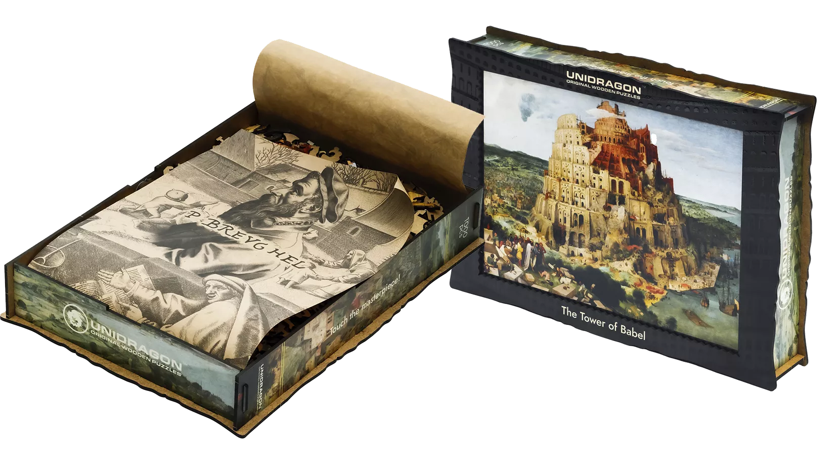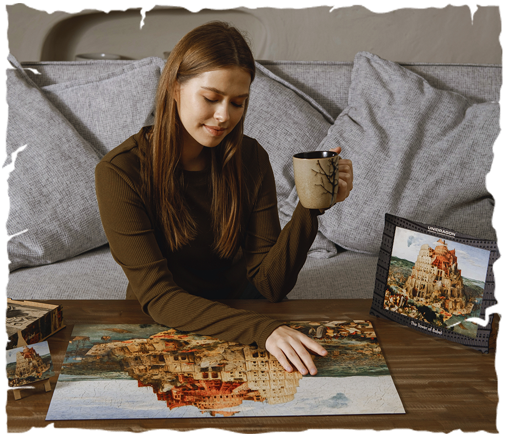 Bruegel's minute details and incredible colors will immerse you in the world of ancient biblical legends and the Dutch Renaissance. We followed the master's footsteps and used layer-by-layer volumetric printing to achieve the effect of multiple layers. Take a look at this volumetric illustration! Layer by layer, step by step you will build your Tower. Among the whimsy pieces of the puzzle there are Bruegel's encrypted name, his paintings and hobbies. And, of course, hidden thematic mini-puzzles so you could immerse yourself into the distant era of the artist.