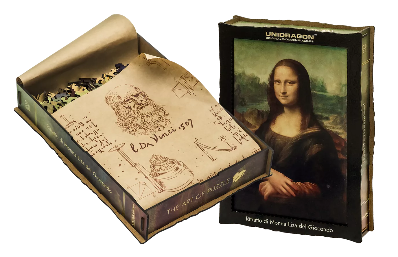 The most mysterious and famous painting in the world. We carefully preserved the unique tone, the slightest cracks in the coating and the style of painting of the artist. Whimsy pieces will show you the artist's hobbies, and the history of his formation. Premium gift box with craft paper with drafts and sketches by Da Vinci inside.