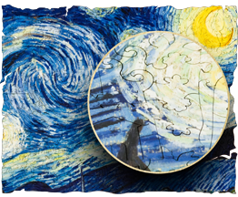 The puzzle has a voluminous finishing — it imitates Van Gogh’s expressive strokes and his personal painting technique. The whimsy pieces present the story of his difficult life and incredible creativity.