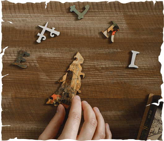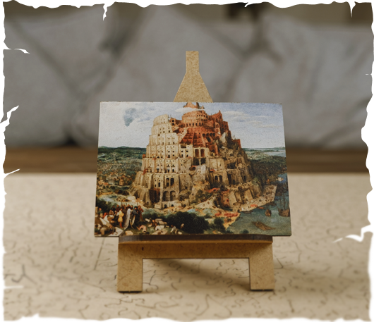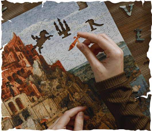 The puzzle has a premium-quality packaging: a lacquered wooden box and a craft paper with Bruegel’s drafts and sketches. Each box contains a mini-easel with a copy of the painting — your clue for assembling the puzzle.